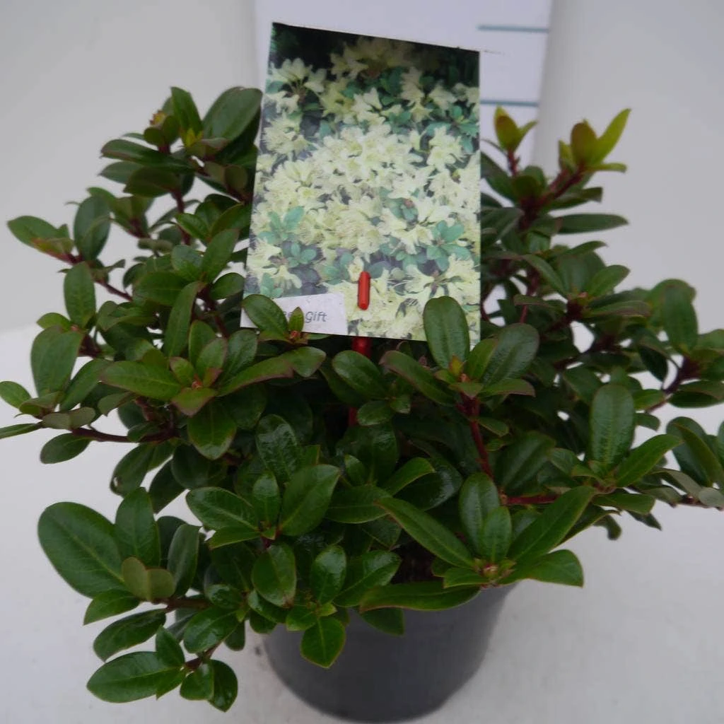 Rhododendron ‘Princess- Anne’ heeft kleine bladeren en kleine gele bloemen vanaf mei.
