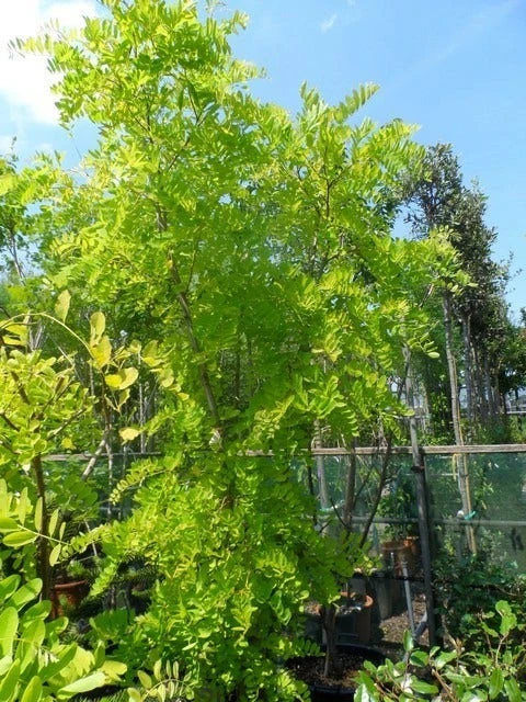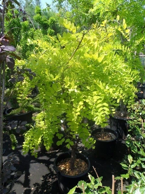 Robinia pseudoacacia ‘Frisia’ (Gele Acacia) is met zij gle bladeren een opvallende verschijning in de tuin. Robinia pseudoacacia ‘Frisia’ kan een boom van circa 10 meter hoog worden, Deze gele Acacia houdt een open kroon waardoor er nog veel zonlicht doorheen schijnt. De takken van Robinia pseudoacacia ‘Frisia’ zijn scherp gedoornd. In de zomer komen er roomwitte bloemetjes aan de Robinia pseudoacacia ‘Frisia’.